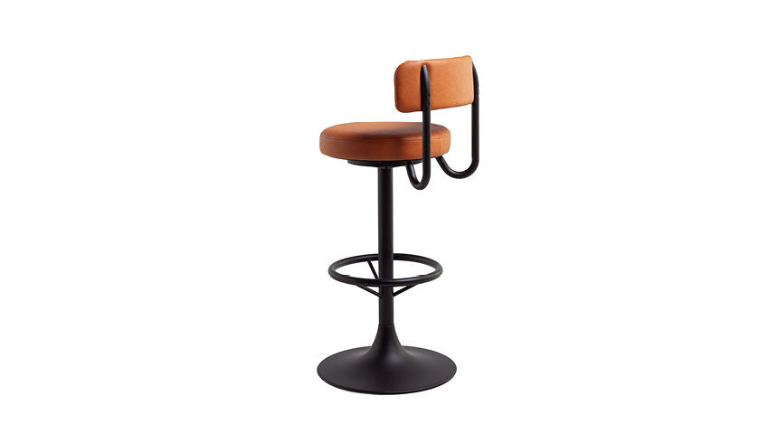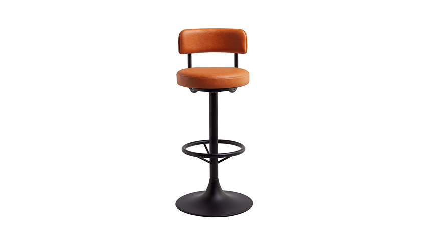 Sgabello con base tonda a campana, realizzato con tubo tondo centrale e fornito di sistema girevole a 360° di serie. Seduta e schienale personalizzabili con tessuto o pelle.
