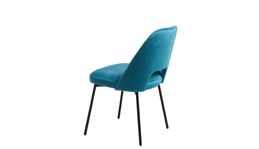 Sedia con struttura a quattro gambe, realizzata in tubo tondo, abbinata ad una scocca personalizzabile con tessuto o pelle, con incavo sullo schienale.